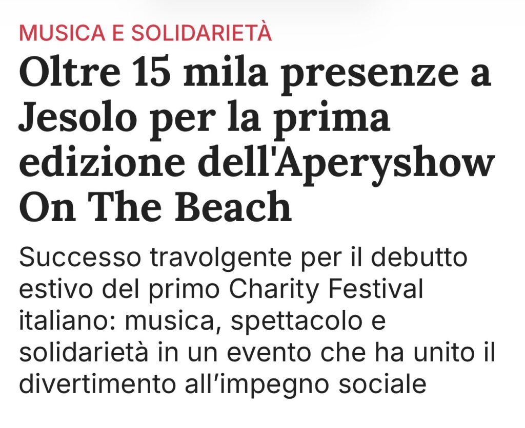 La Spiaggia del Faro si è trasformata domenica 3 agosto in un palcoscenico a cielo aperto per Aperyshow On The Beach, la prima edizione estiva del celebre Charity Festival italiano che ha richiamato oltre 15 mila persone da tutta Italia. Un evento straordinario che ha combinato musica, spettacolo e solidarietà, lasciando il segno nel cuore di Jesolo e del suo pubblico.