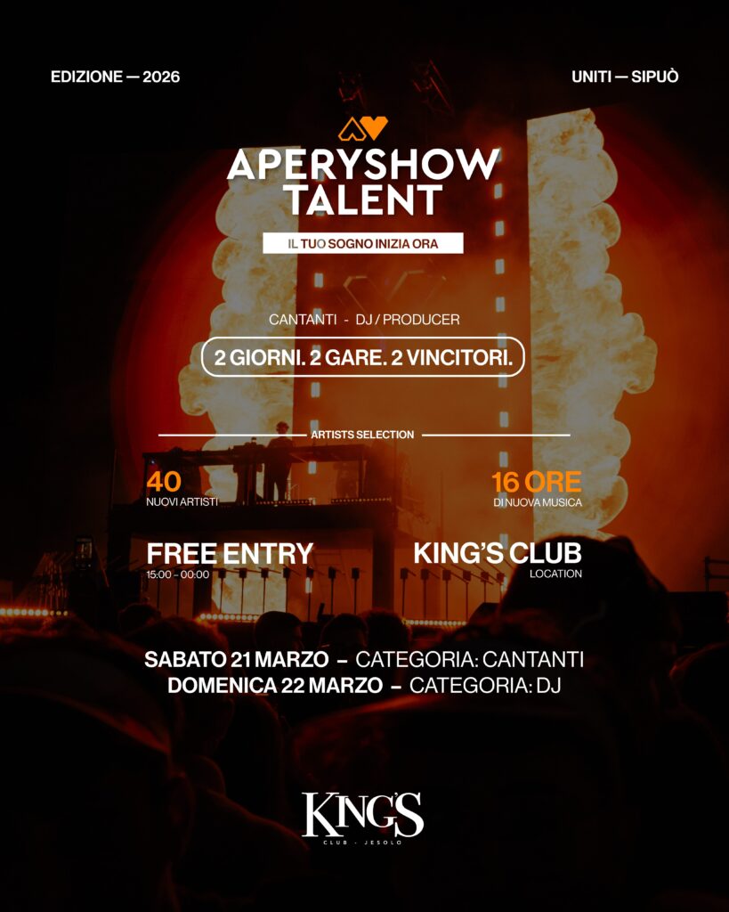 Provenienti dalla selezione di King’s Club, i finalisti vincenti si esibiranno durante le serate di APERYSHOW, dove avranno la possibilità di far ascoltare la propria musica al grande pubblico, pronti a far decollare la propria carriera musicale.